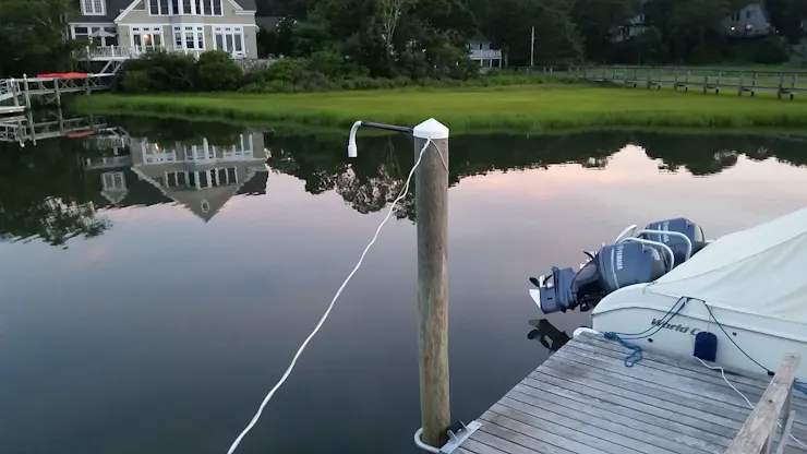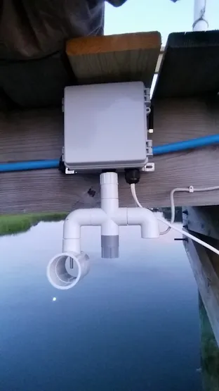 The electronics are mounted inside a water proof enclosure, which in turn is mounted on the side of a wooden pier. The DS18B20 waterproof sensor is mounted inside a PVC Tee to shield it from the sun. Power is available at the end of the pier.