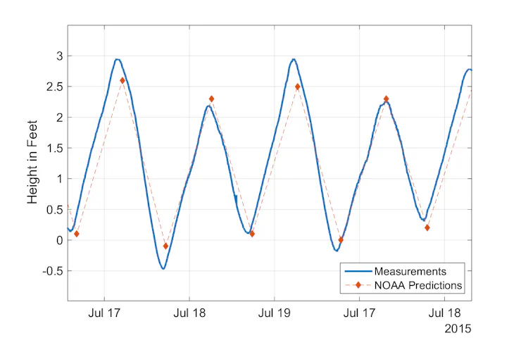 Not surprisingly, comparisons between predicted and measured tide levels in Popponesset Bay show that the accuracy of these forecasts is nowhere near as good as the Boston predictions.