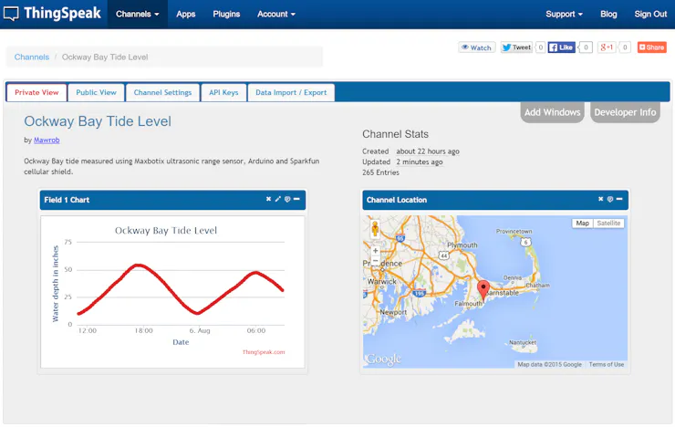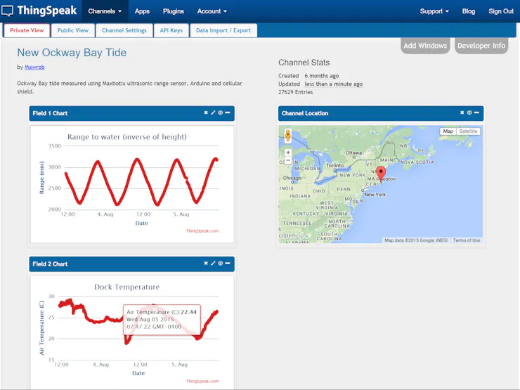 The tide gauge sends range and temperature data to a channel on ThingSpeak approximately once a minute.