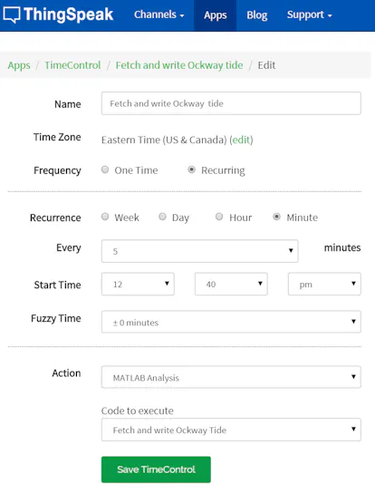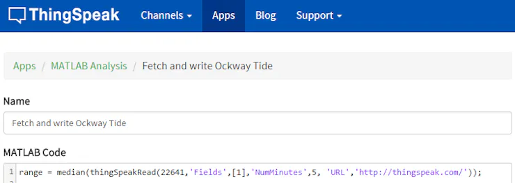 A ThingSpeak Time Control runs the “Fetch and write Ockway Tide” MATLAB Analysis every 5 minutes.
