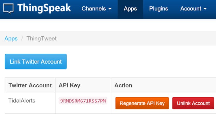 I used the ThingSpeak ThingTweet app to link my Twitter account to ThingSpeak.