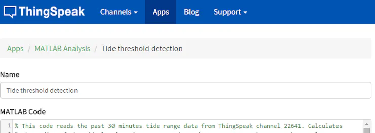 Here is the MATLAB code that I wrote to detect when the tide level goes below 20 inches or rises above 15 inches and write the value of the tide levels to ThingSpeak Falling Tide and Rising Tide channels that I created.
