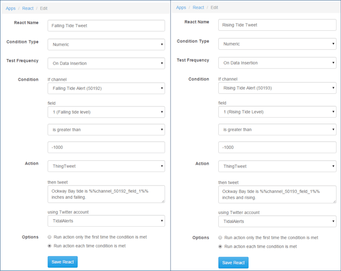 I created two ThingSpeak Reacts to detect each tidal event and to send an alert using ThingTweet every time the tide passed a certain threshold.