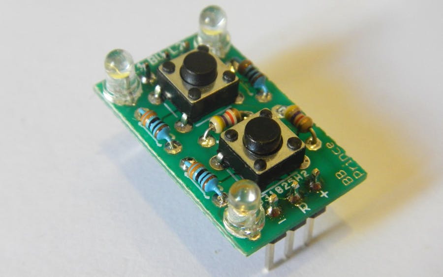 This PAW is a small utility board for your breadboard that have some of the most common things you need when building a microcontroller-based project on the breadboard. It's a small (2.5x1.5cm / 1x0.6”) PCB with a Power Led, a Reset button with a pullup and goes low when pressed, a Signal button with pulldown that goed high when pressed and two general Indicator Leds that are connected to ground via resistors.