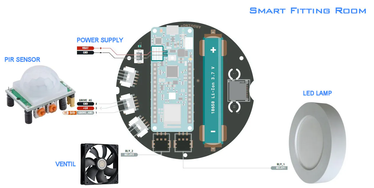 - Finally, the presence of an IOT device within each fitting room allows the "occupied" signal, but also to reduce energy waste, as the lighting and the ventilation system can only be turned on when the fitting room is actually occupied by a customer.