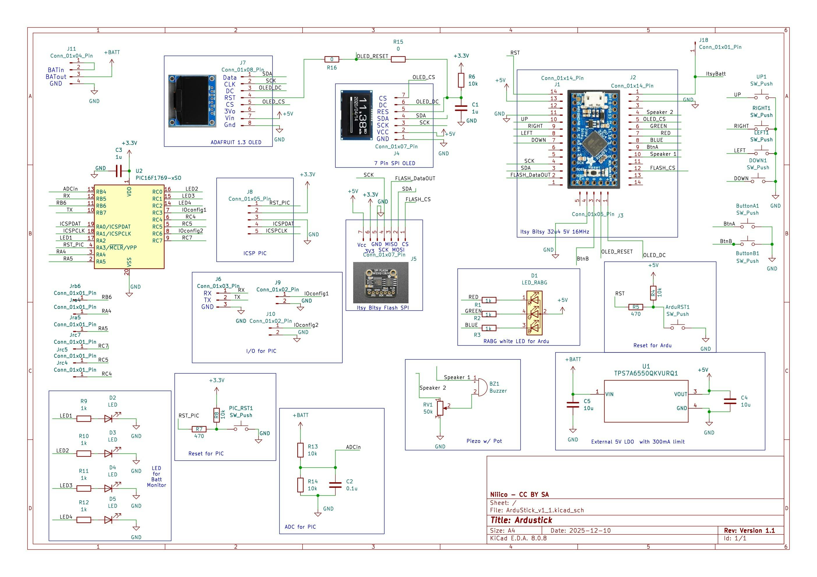- Use a second 8bit microcontroller to monitor the battery voltage. I wanted to keep the ATmega32u4 as a “standard” homemade Arduboy, and so, I added another core - not arduino this time, but with a PIC16F family. It will read the battery voltage, scaled down with a resistor divider, then ADC and blink the 4 added LEDs to show the state of charge. The PIC16F is supplied by the 3.3V regulator from Adafruit’s Flash module I used