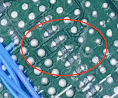 Once some of the balls are removed, there is room to do all of the jumper connections. There are 20 in this design. The balls are adjacent to each other therefore you can use a 0 ohm 0402 resistor to place between each and easily bridge each jumper. All of the jumper connections have adjacent solder balls, so you can easily place them with your tweezers and soldering iron