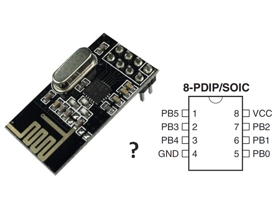 Thus, no pins are left to connect with sensors or other devices. In reality, we have available only 5 data pins because one of the data pins (e.g. PB5) is by default used as RESET/dWIRE for programming and debugging. Configuring pin PB5 as GPIO would later require high-voltage programming (firstly applying 12V to reset fuses) which is a cumbersome solution and not feasible for designs with In-Circuit Serial Programming (ICSP). Therefore, we have to minimize the number of pins on MCU required for communication and control with the nRF24 module. This has also implications for the software driver.