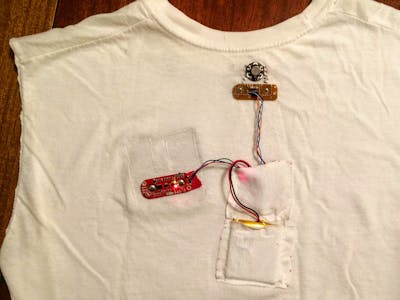 Step6: Sew. I started by sewing the sensor pads to the t-shirt. It's kinda tricky to attach non-stretch fabric to a knit t-shirt. That's all for inside the shirt. Everything else is sewn to the outside.