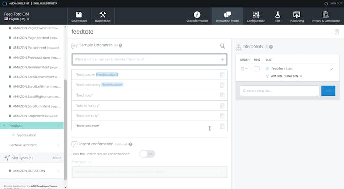 Following the Alexa Voice Services and Alexa Skills Kit documentation, I created a custom skill called: "Feed Toto" this skill listens to the following sample utterances: