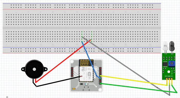 The input from Ir sensor is taken at digital pin 0 and output for buzzer is written at digital pin