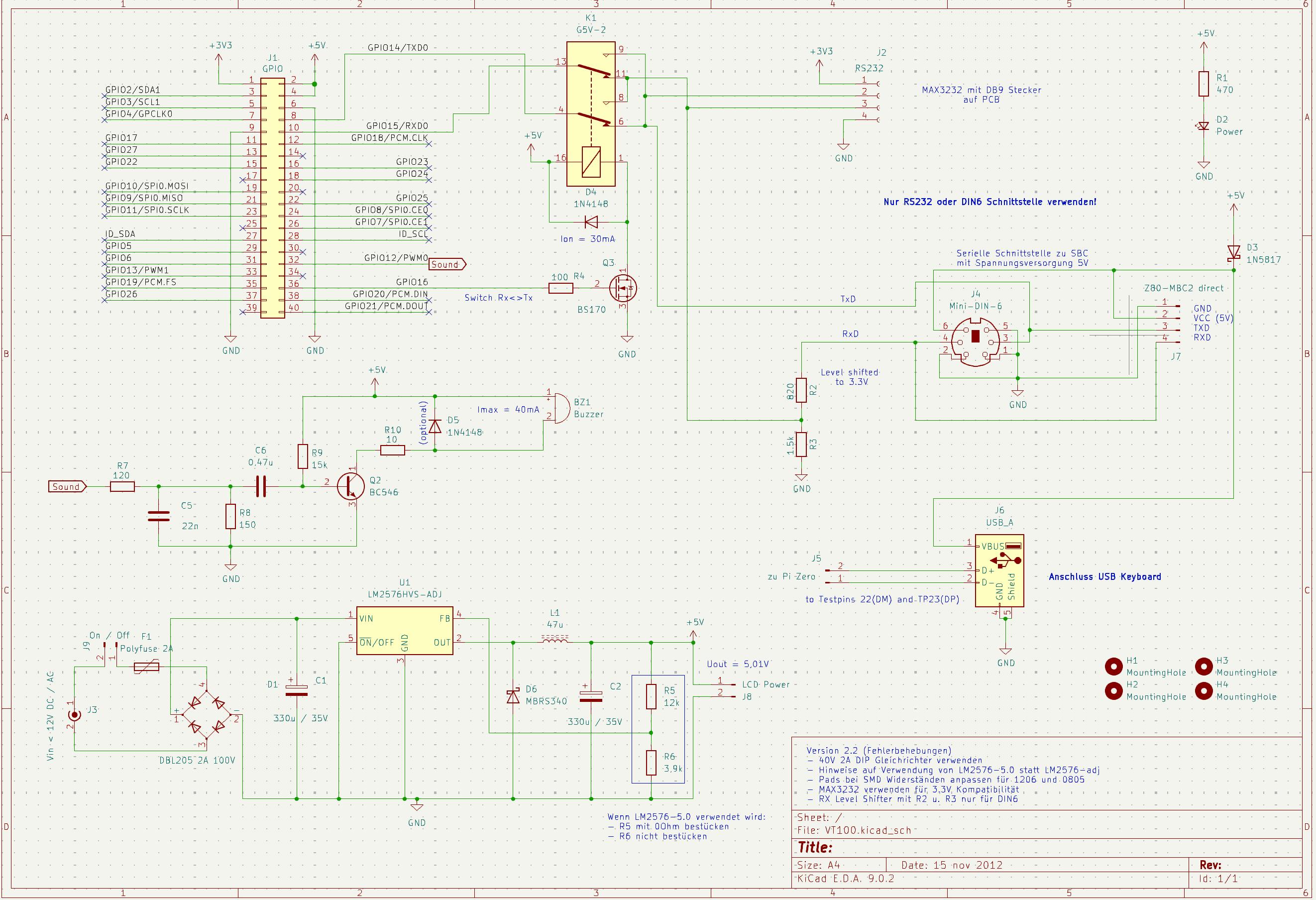 To realize these software capabilities in a practical end-to-end system, dedicated matching hardware was also designed and built. A pcb including the power supply, support for RS232 connector, custom Mini DIN6 connector to my MBC2-Z80 with CP/M, usb type A keyboard and power connector. The board supports characteristic 800 Hz buzzer and key clicks and allows to switch Rx/Tx lines if required to simulate a hard to find null modem cable.