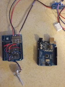 A 10 K Ohm potentiometer is connected to 5VDC, ground, and the wiper is connected to the analog input (A0). This generates values between zero and 1023 to the Arduino. This value gets converted to a range of 30 to 50 and is used to as a set point for the humidity. It is compared to the humidity read from the DHT22 and is used to trigger the solenoid to supply water to the Humidifier.