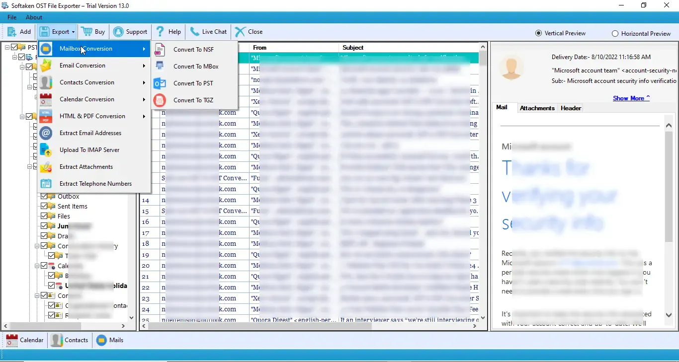 - Preview: The application shows a preview of emails, attachments, contacts, and other things from the OST file.