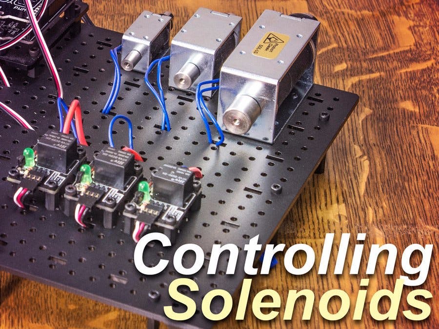 This Arduino Solenoid Tutorial shows how to control a solenoid using pushbuttons and a relay with your Arduino compatible controller. Solenoids are electromagnetically driven actuators. When voltage is applied to the solenoid coil the electromagnetic force pulls the center plunger in. It is an excellent mechanical solution for all kinds of DIY projects requiring short quick linear actuation. Solenoids are most often found in latching and trigger-like mechanisms, such as door locking systems, paintball guns, pinball machines, dot matrix printers, and fuel injectors. Let's get started.