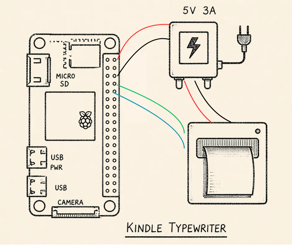 - Raspberry Pi → printer: GND → GND, Pin 8 (TX) → Printer RX, Pin 10 (RX) → Printer TX