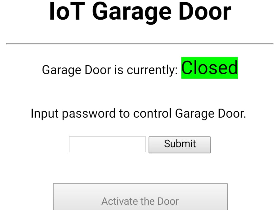 The magnetic door switch tells us when the door is closed or open and a webpage displays all of this. A 4 digit numerical password is needed to operate the door from the webpage. Ajax is used to keep the status of the door updated on the webpage.
