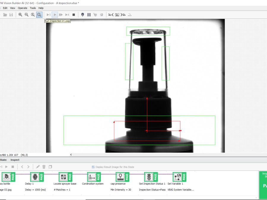 NI Vision Builder AI (VBAI) :The image set of the material should be inspected is uploaded on the VBAI main window. The chance of the defect of the material should be known according to that the program should be done on the VBAI. For example here the sprayer bottle is checked for the presence of the cap on its top.If the cap is missed the material is defect I result. The region of interest is draw on three side by using color intensity the presence of the cap can be identified.
