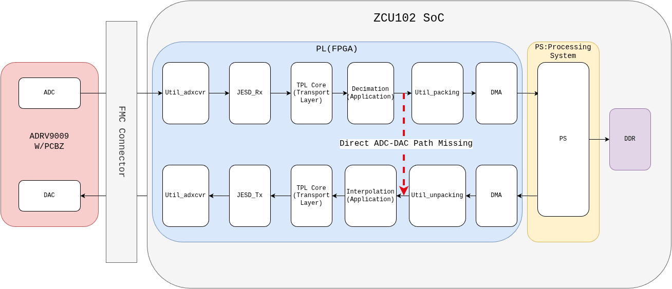 Figure 1 illustrates the motivation for the digital loopback. The dark black arrows show the default reference design path, where ADC samples go through AXI DMA and DDR memory before reaching the DAC. The dashed red arrow indicates the direct ADC-to-DAC path that does not exist in the reference design.