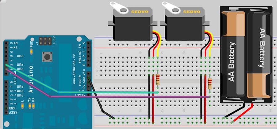 Setting up the circuit involves connecting the servos and potentiometer to the Arduino as follows: