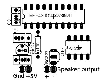 The final product uses a standalone MSP430G2452 which reads samples from an AT25DF32 SPI flash memory, sound is played by a PWM driving a transistor at 62500Hz.