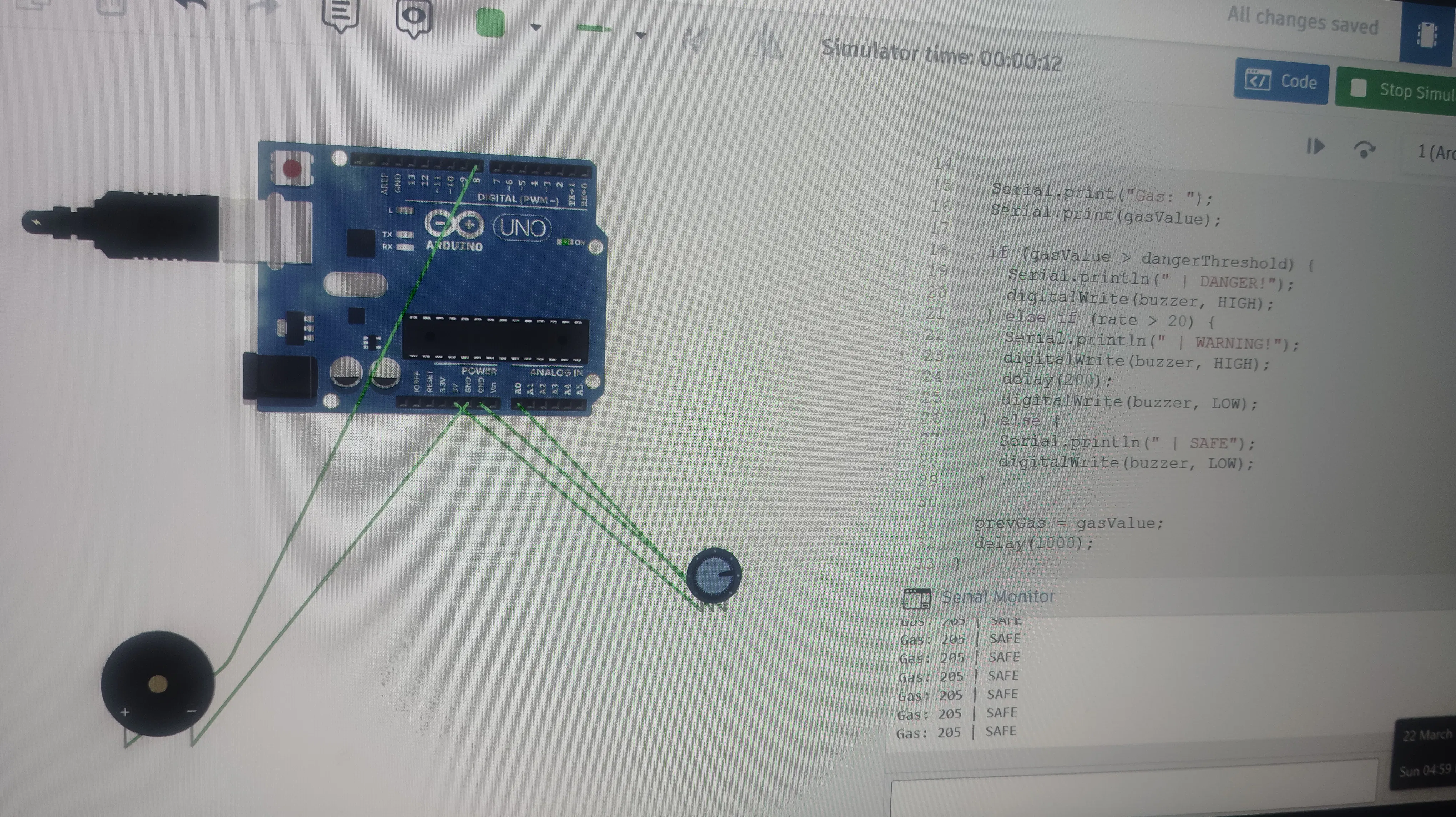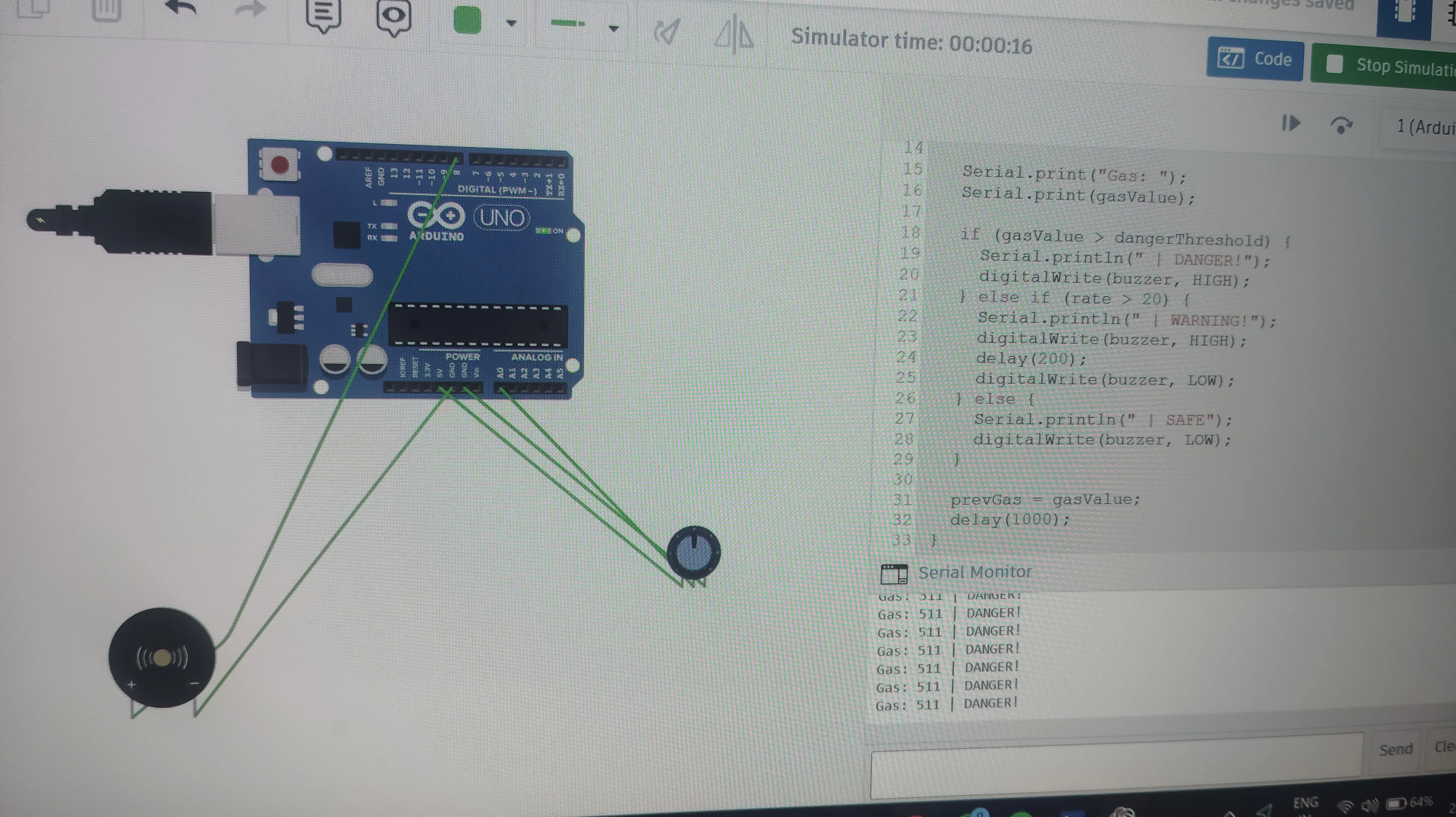 Testing in simulated conditions shows that PRAHAR can:Detect rapidly increasing gas trendsProvide warnings before critical thresholds are reachedAutomatically trigger alerts in high-risk conditionsExample:Gas level reaching ~430 → Danger detected and buzzer activated