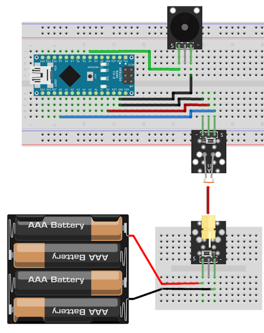 Using an Arduino - we are using a Nano V3.0 compatible board - we want to demonstrate on how an alert system could be build, where an alert is triggered if an object interrupts the path of light.