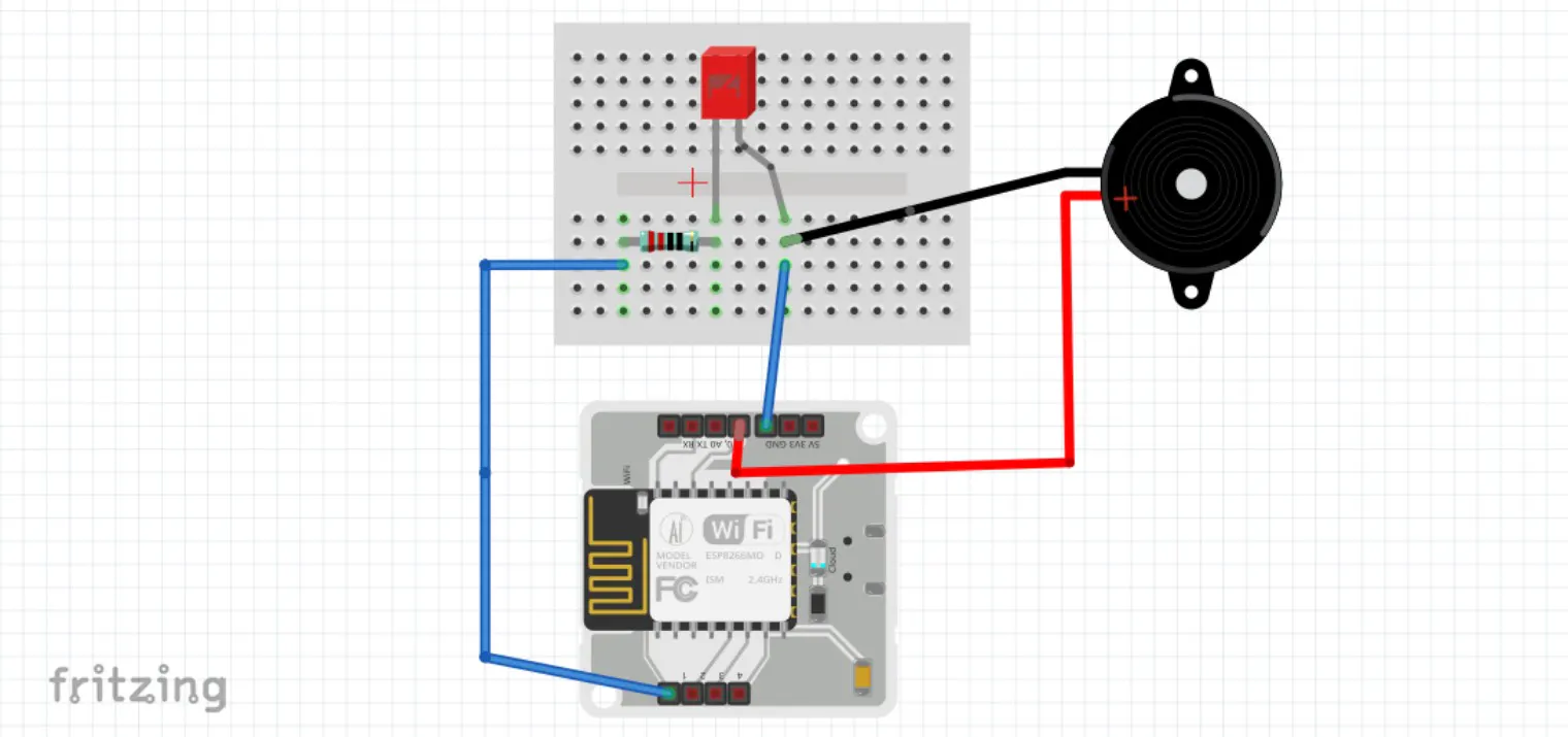 - Then connect the +ve end of the buzzer to the 0 pin of the module and -ve end to the Ground pin in the bread board using male to female wires.