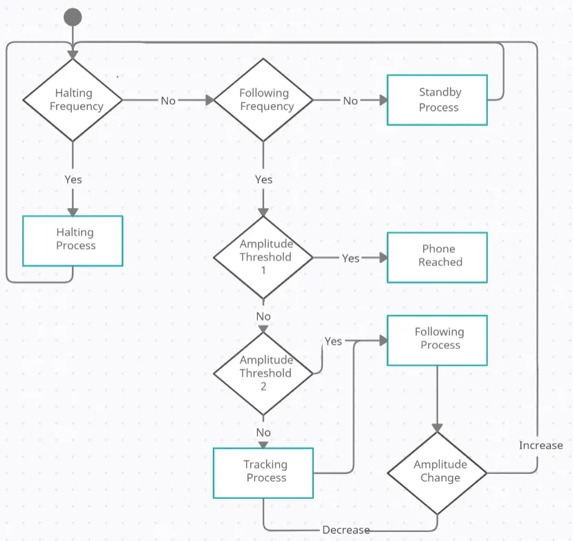 During tracking and halting processes, the segbot rotates clockwise for 1080 degrees, saving the direction in which it receives the largest sound signal with the specific frequency. Then, it rotates counterclockwise back to the saved direction. To prevent random noises or other errors affecting the accuracy of detection, the amplitude of sound signal must be continuously incrementing when moving towards the direction and continuously declining when moving away. The “halt” frequency also takes priority over the “follow” frequency if both signals are received.