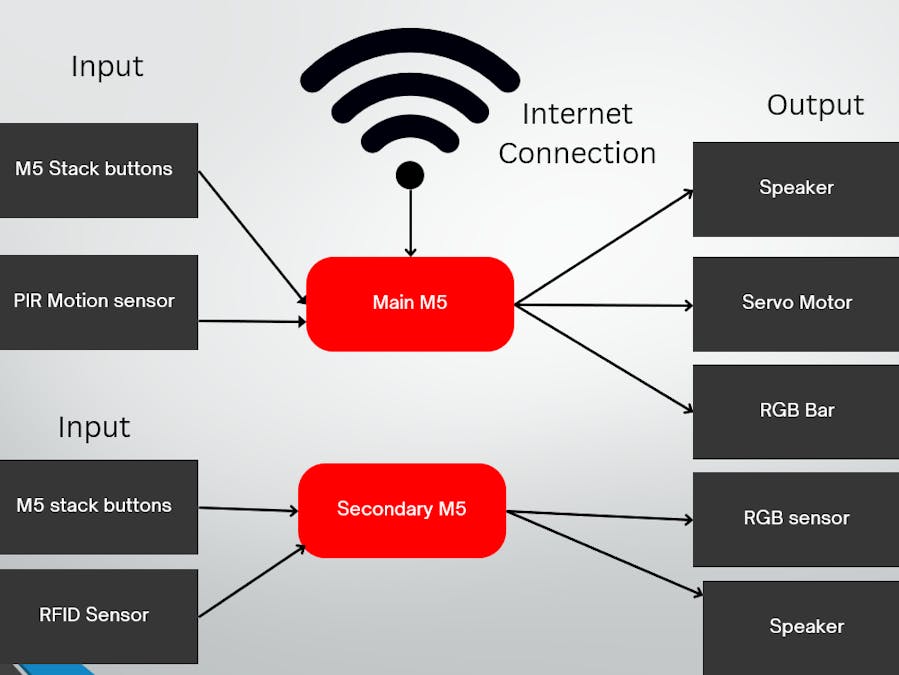 The Main M5 Stack, with buttons A to increase time(in hours) and B to decrease time and C to set time, allows the helper to set the time for the elderly to take their medicine. The elderly will be alerted with a speaker and a message to take their medicine by placing their hand under the PIR Sensor. The Servo motor will then drop the medicine if they place their hand under the PIR Sensor. With the QR Code, the helper can go to a website to see if the elderly have taken the medicine yet. 1 indicates Yes and 0 Indicates No.