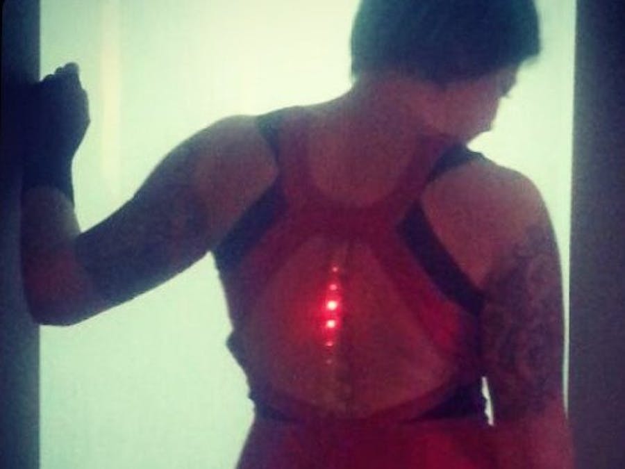 After the electronic spine was crafted, it was installed in a dress I customized to have a Caprica Six-like styling with an open back. To make the spine easy to remove when the dress needs to be washed, I used metal snap fasteners at the top and bottom of the piece.