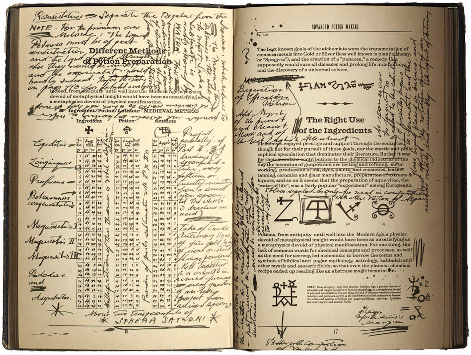 Using this image of a page from "Advanced Potion Making", print it out, fold down the middle and place it over the existing pages of a real paperback book of equal size. As only one page of the book is visible it gives the illusion of being an entire book on potion making. Simple, yet effective.