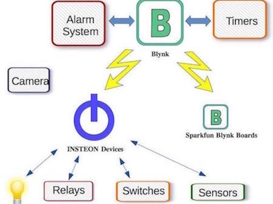 The Virtual Wiring system supports a variety of hardware devices (Blynk devices, XBee devices, Z-Wave Devices, Arduinos, to name a few), and if you can do some Ruby programming, you can add your own devices. For our system, we'll use a number of Virtual Devices (devices which function without any hardware requirements), INSTEON devices, a Sparkfun Blynk board, and an iPhone or Android phone.