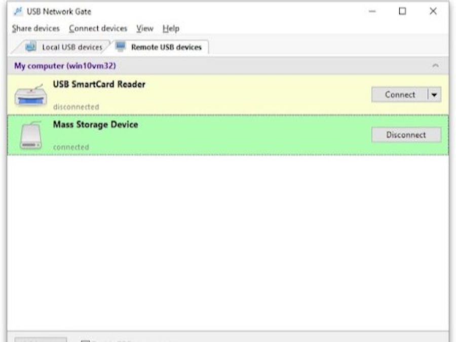 Select the Remote USB devices tab in the software’s main window. All devices shared from the server will have been recognized by the client and are automatically added to the list of devices which you can select.
