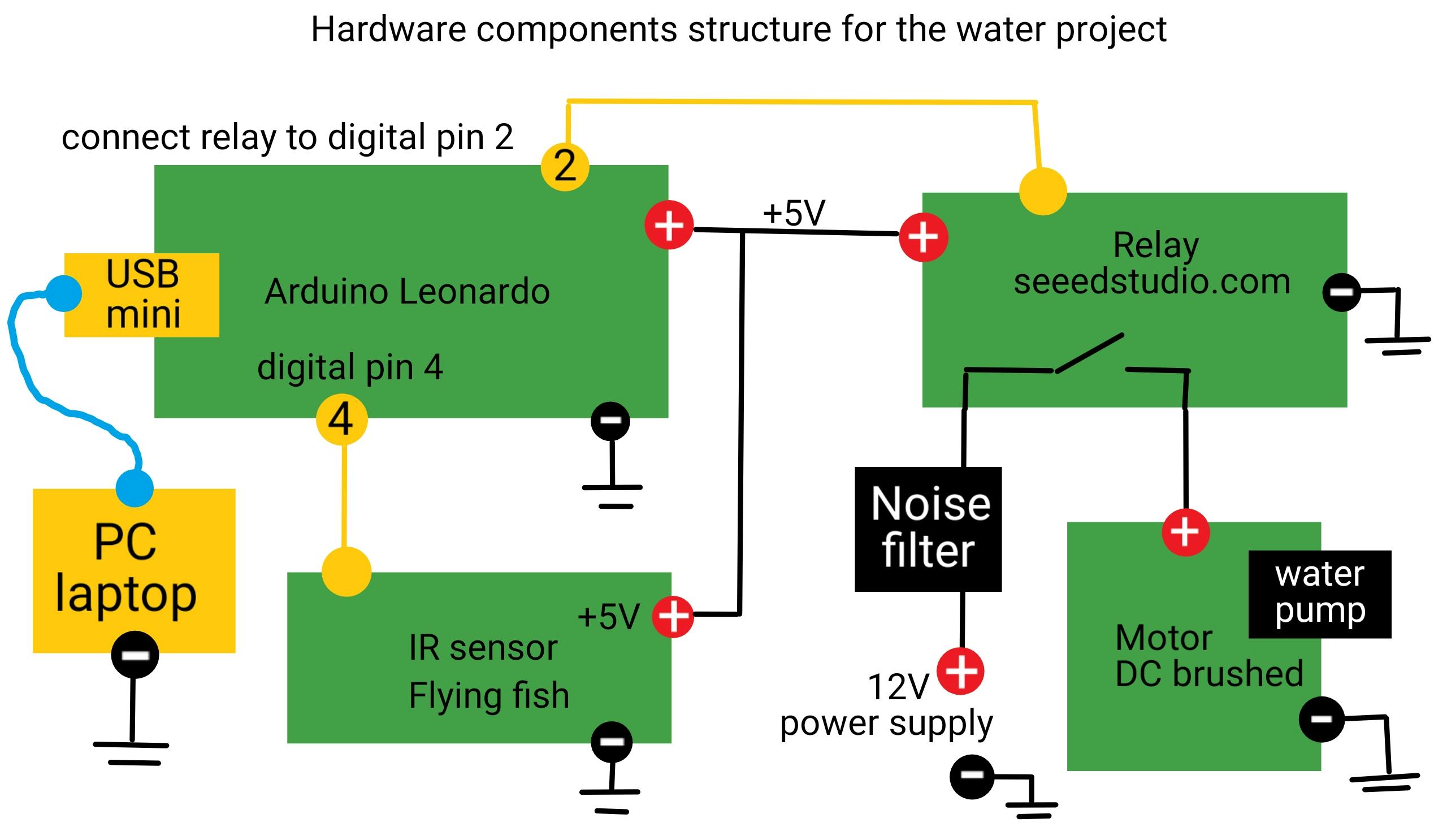 The water pump is powered by a separate 12V supply. However, a noise filter is mandatory because the Arduino Leonardo is very sensitive to electromagnetic interference (EMI) and may freeze after the relay operates and switches the brushed motor. Additionally, the USB cable connecting the Arduino to the PC should be as short as possible and equipped with a ferrite bead.