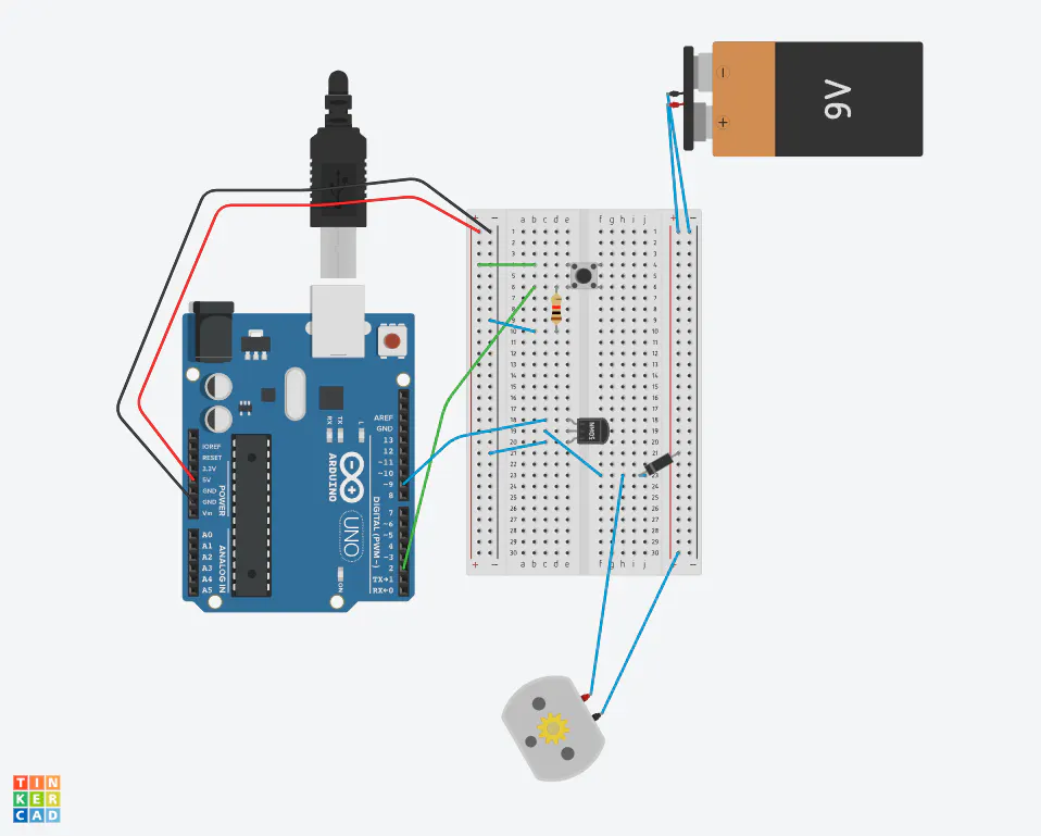 This project accomplished making a pinwheel using a push button as the input and the activation of the motor as output. This project required a 9v volt battery and a transistor, since the high power flow needed by the motor complicates its usage more than other components that work fine with 5v of power. The most challenging aspect was building the circuit, which wasn’t too difficult itself. I’d rate the difficulty as a beginner because despite being number 9 this project was actually pretty straightforward. This one took me a little less than an hour to complete. The orientation of my breadboard usually adds about 5-10 min extra on my build times due to troubleshooting having to use different jumper wire lengths. I could see this modified to make a mini desk fan, making some diy fan blades instead of the pinwheel that came with the kit.