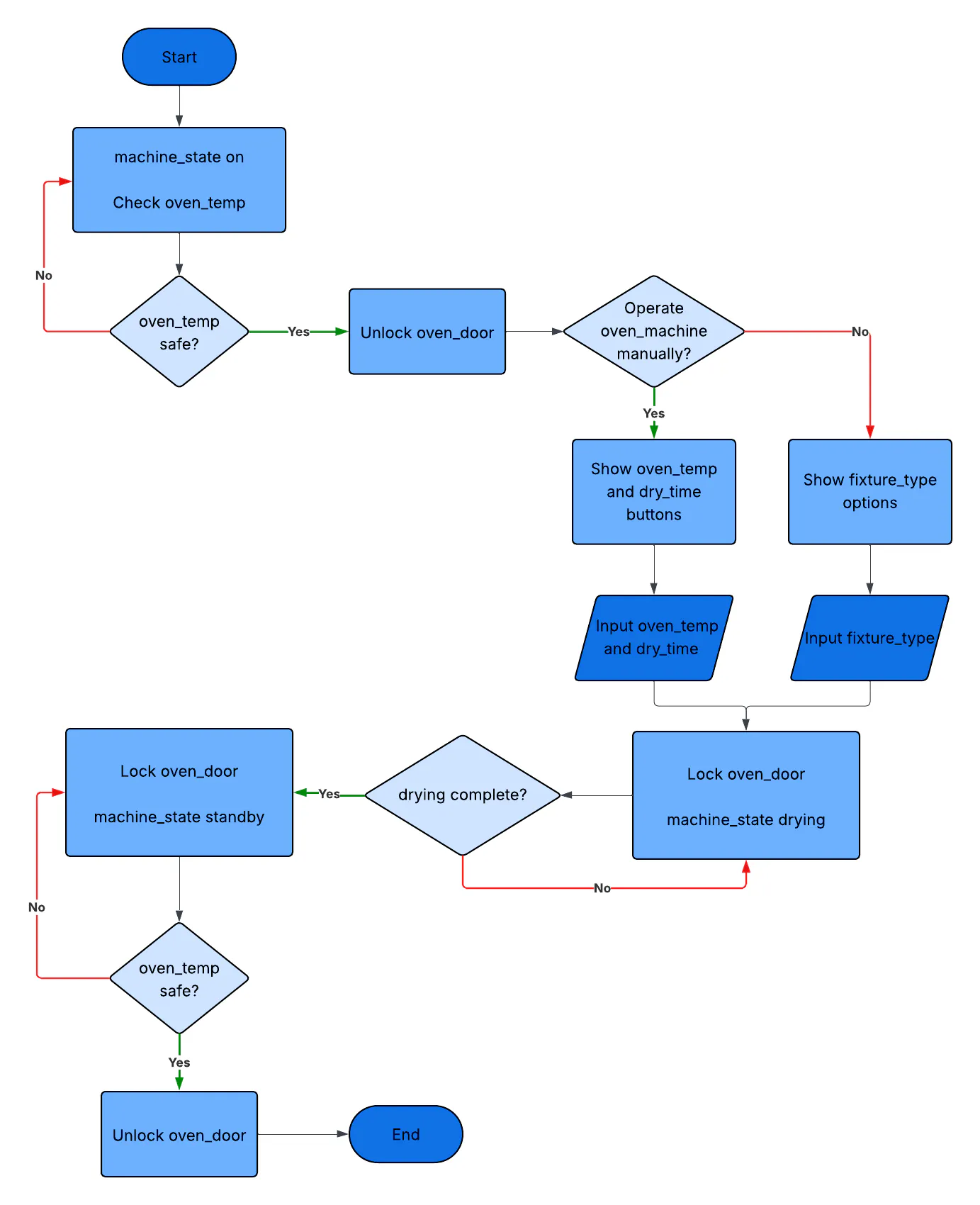- Safety logic—represented by red or green circles—locks the door and warns users at unsafe temperature levels using real-time notifications.This digital twin approach allows safe prototyping and easy modifications, laying the foundation for real-world oven automation, process monitoring, and user experience research. Future work may add user-defined presets, remote control, data logging, and more.
