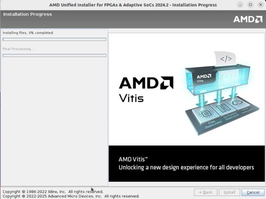 Run Vitis InstallerIf using the SFD installer, unzip the compressed file with a command like tar then change directories into it and run the installer xsetup: