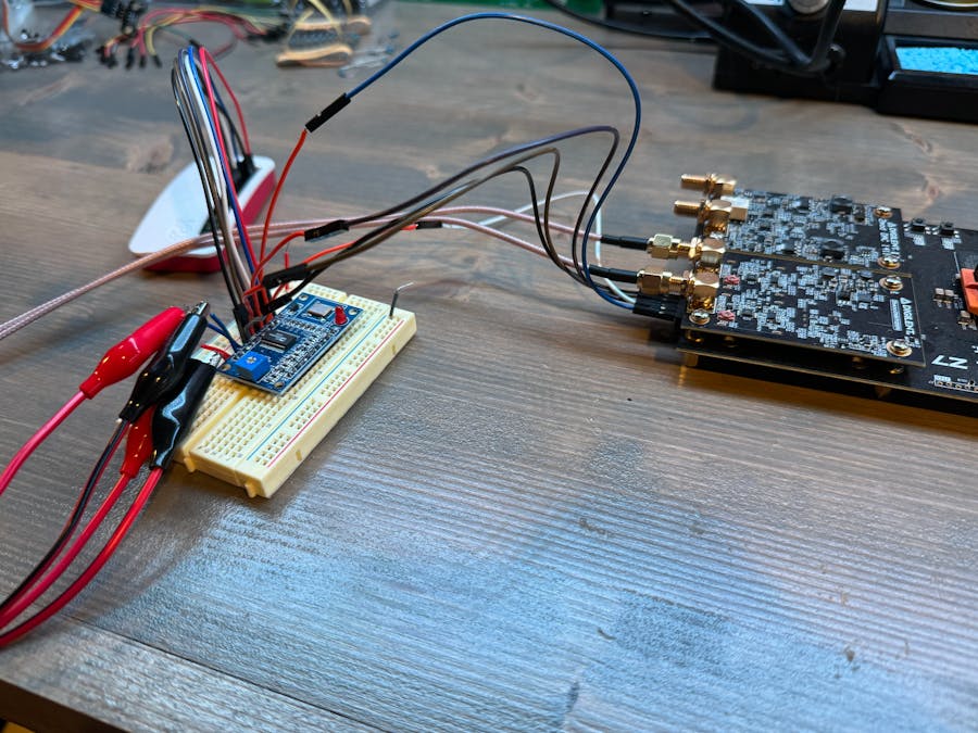 And to my pleasant surprise, interface looked right on the first pass. The only tweak I had to make was to add three clock pulses in-between the RESET signal being pulsed and the next FQ_UD pulse (as specified by the AD9850 datasheet). I noticed on some passes though, there was a pause on the whole interface after the first W_CLK in a transaction. I never figured out what caused this as it was not a part of the code in my Python script, but it didn't seem to have any affect on the output so I'm not going to worry about it for now.