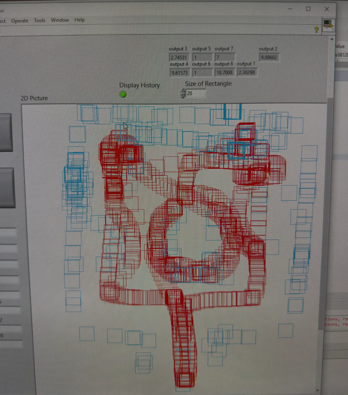 The robot uses a unique strategy to map throughout the wooden area. Way points are set throughout the area for which the robot has to reach. The robot does this using LADAR data to make a decision between using left wall follow and right wall follow. This is done by the comparison of the LADAR front right and left data. The robot continues its path consistent with decisions on which wall follow it should pursue. The robot navigates throughout the area avoiding obstacles through its wall following. As this is done, data is sent to the LabVIEW. Red squares denote the position the robot is located at. This data is consistently developed and drawn on the labview as the robot changes positions. Additionally, the robot maps obstacles on the lab view as blue squares. The robot also collects orange and green colored golf balls and after collecting three or more of a single color, then detects for an ID 6 AprilTags to orient to a golf ball drop off location. Each AprilTag detected will vary the color of golf balls dropped off.