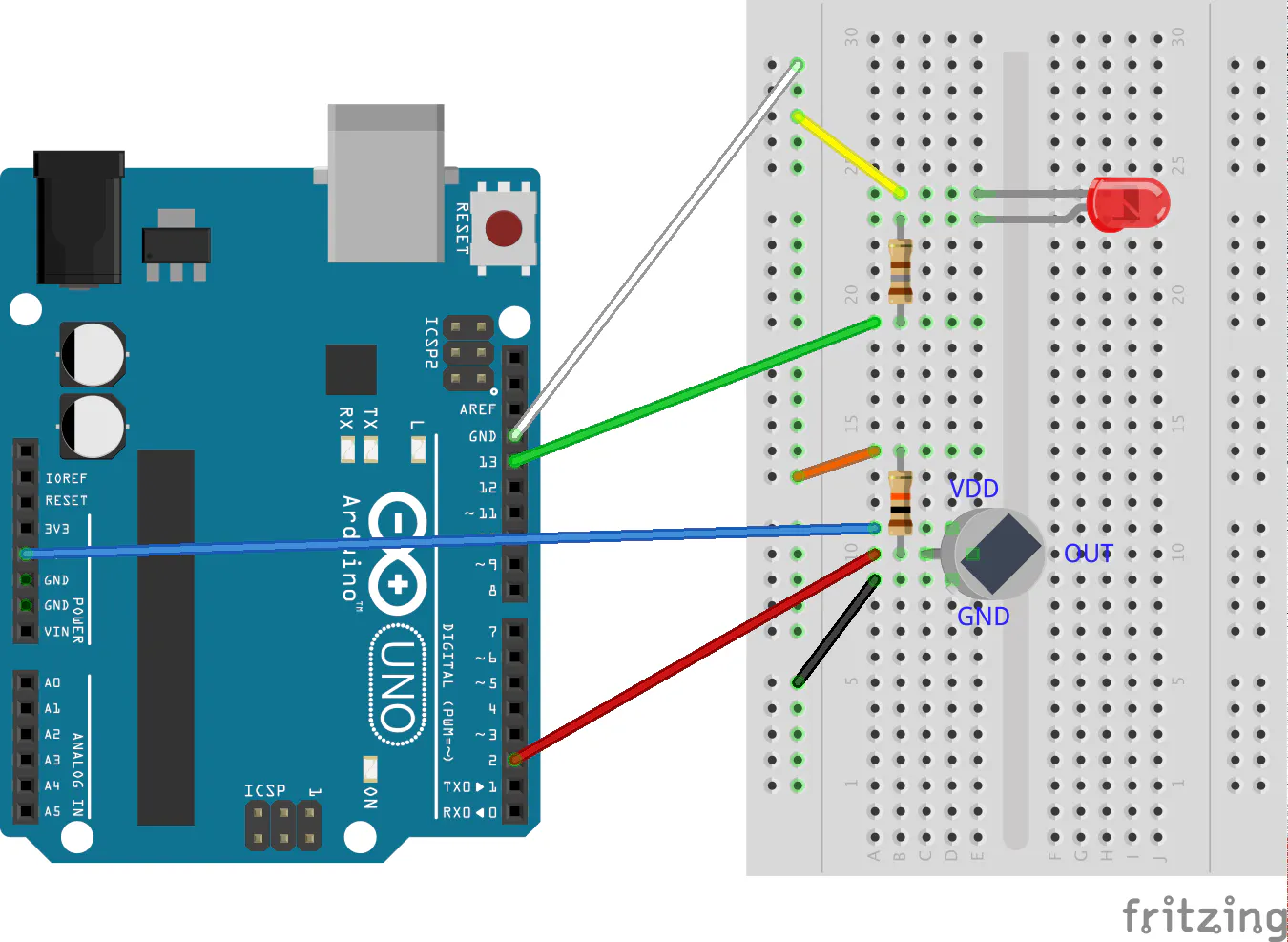 A pyroelectric sensor detects the infrared rays that occur when an object with a temperature difference moves within the detection range. When there are people, it will turn on the LED.