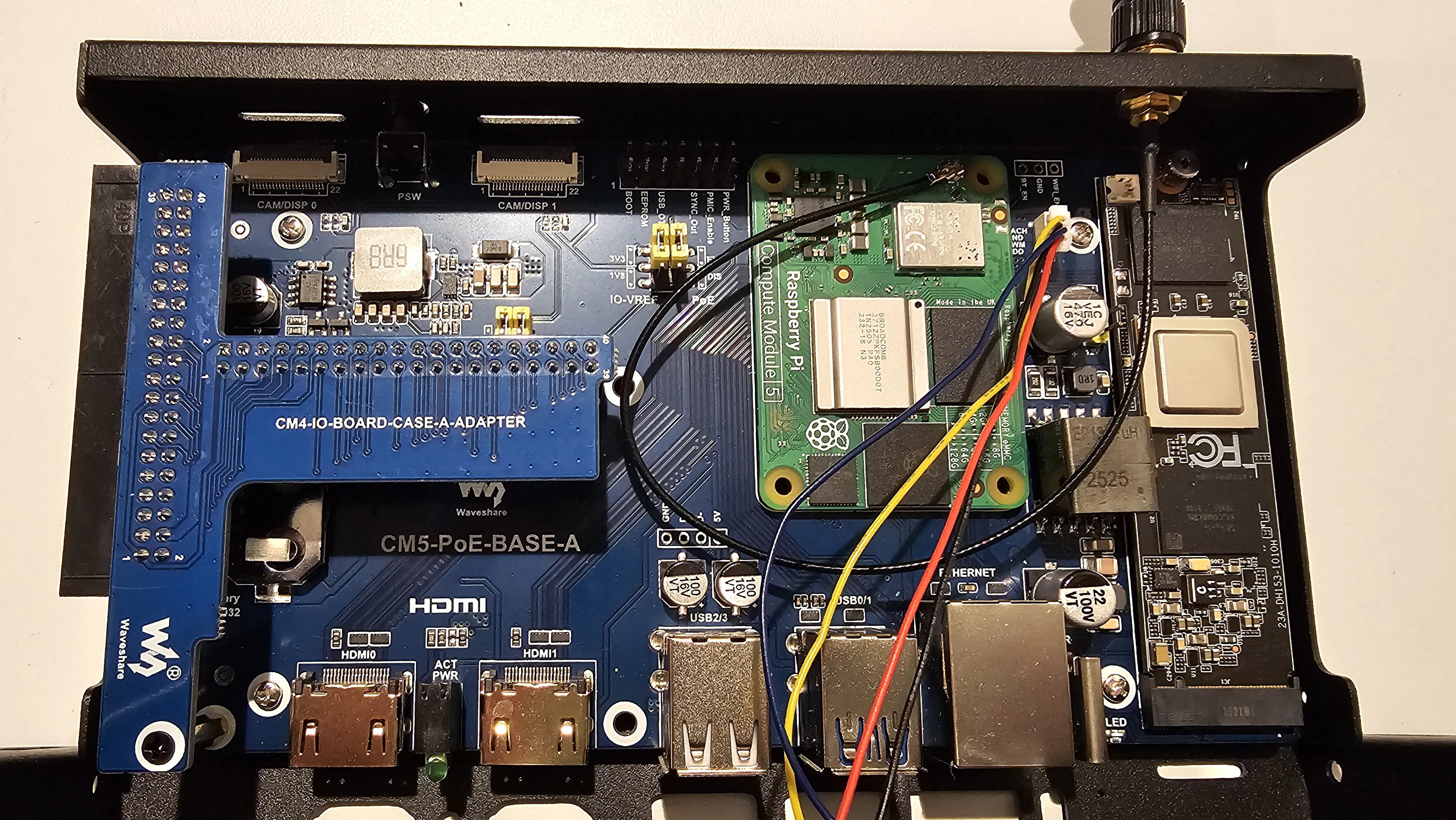 I got this crazy idea of building an ultra-low power system capable of real-time AI inference. When I saw what the DX-M1 could do with 24 TOPS and 5 W TDP, I figured I would find a way to pair it with a small ARM system. One of the things that has always bothered me about the Raspberry Pi is the micro-HDMI. It's very weak and disconnects a lot. I wanted something sturdier. Then I stumbled into the Compute Module 5 platform. I saw the WaveShare CM5-POE-BOX-A with dual, full-size HDMI and fell in love. Finding suitable compute modules is hard, too. I really wanted 8 GB of RAM, but I managed to get a 4 GB unit with 32 GB of eMMC. The eMMC turned out to be a lifesaver because I'm using the NVMe slot for the DX-M1.